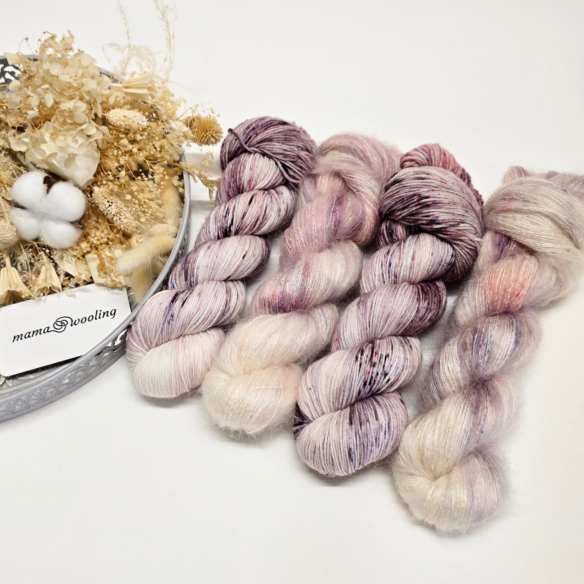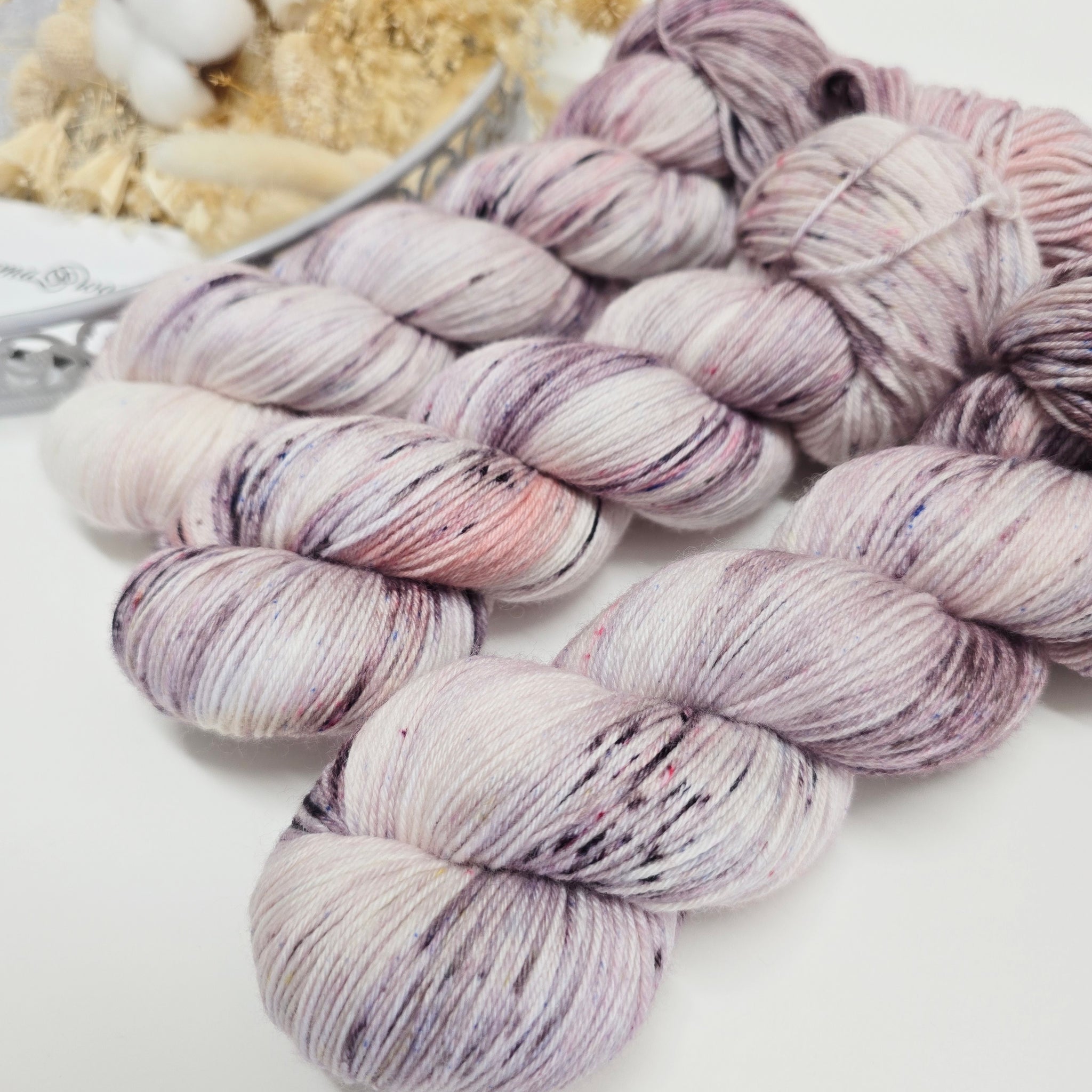 Posy Pop is a fun speckled colourway with deep earthy purples and pops of pink and blue on a creamy base.