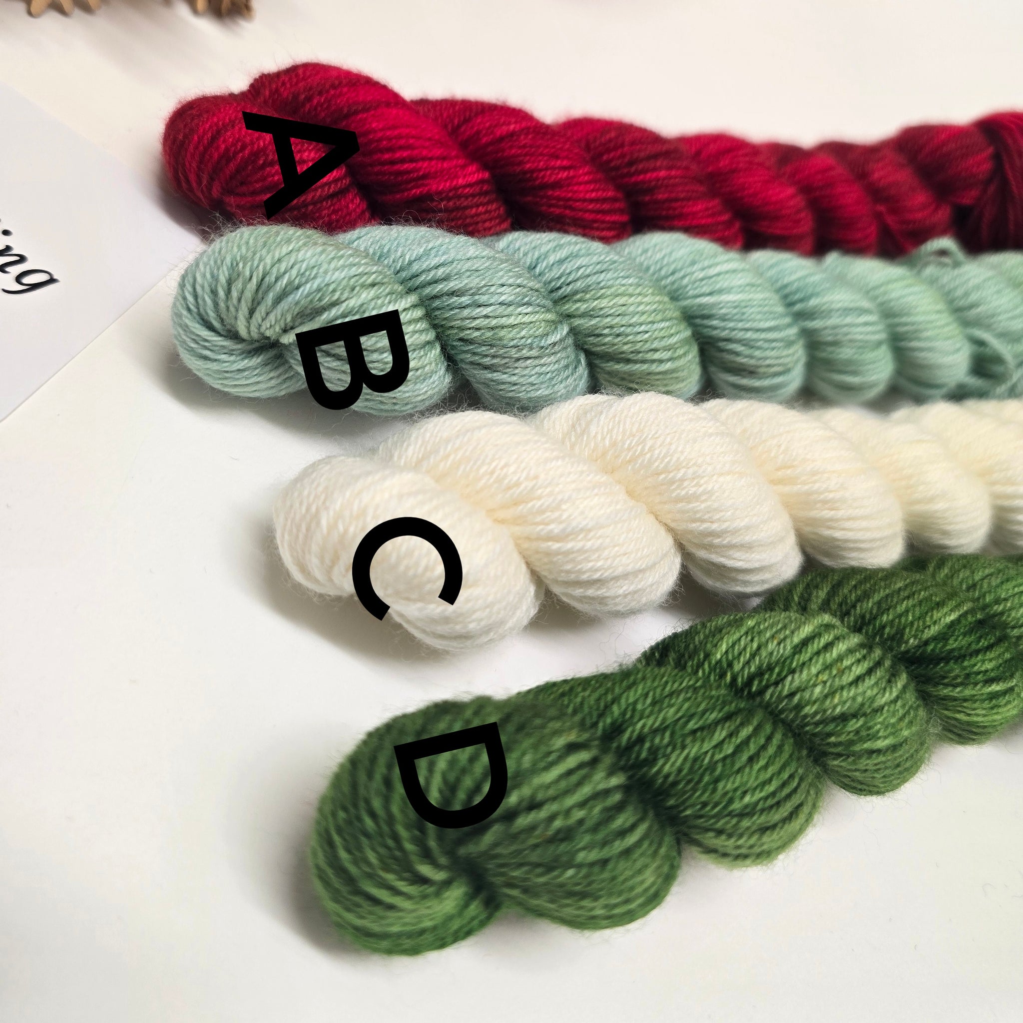 Colours have been specifically dyed with this gnome pattern and the designer's advice in mind (yes I've had a peek!) to ensure beautiful results. You will find a suggested colour order in the pictures but for my kits, you really just need to stick with C as suggested and can use any of the other colours as you wish, pick your tip top favourite for A and go from there!
